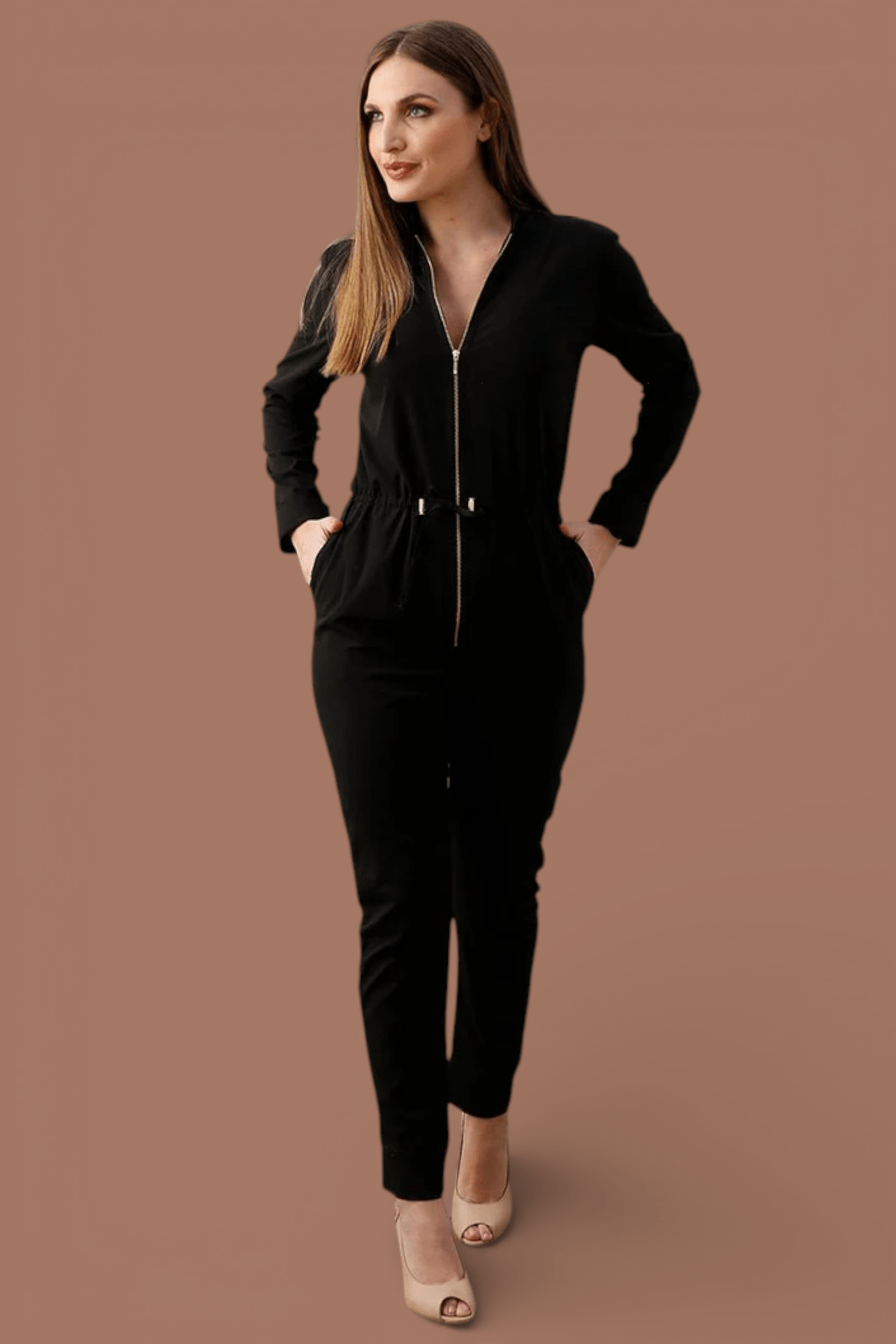 Confeccionado em uma mistura premium de tricoline, elastano e algodão, o Frida oferece conforto, respirabilidade e estrutura impecável. O zíper metálico dourado aparente adiciona um toque fashion e contemporâneo, enquanto o cordão ajustável na cintura — também com acabamento dourado — permite um caimento perfeito e personalizado. Funcional, moderno e cheio de estilo, o Macacão Frida é feito para mulheres que desejam performance e personalidade em uma única peça.