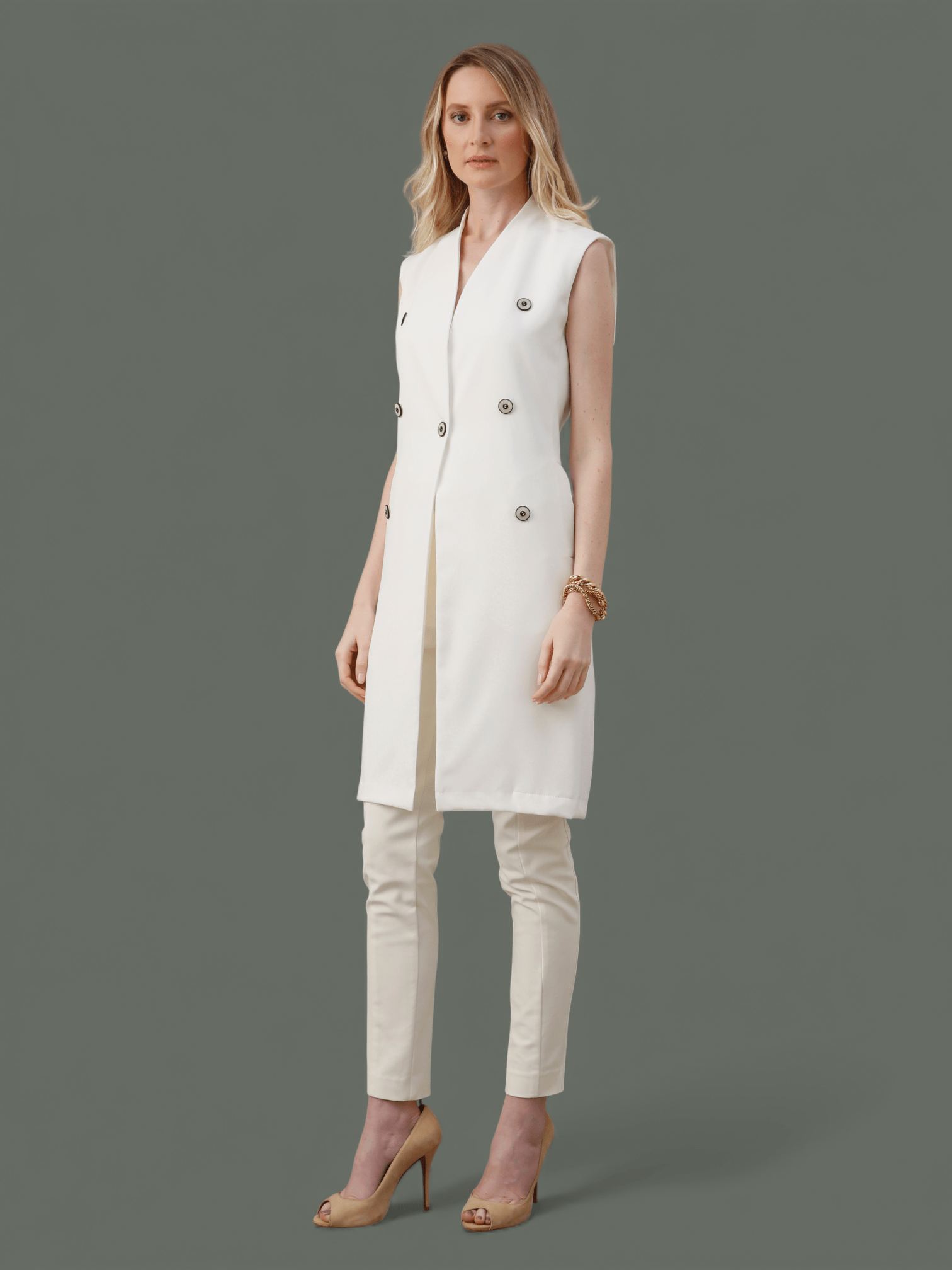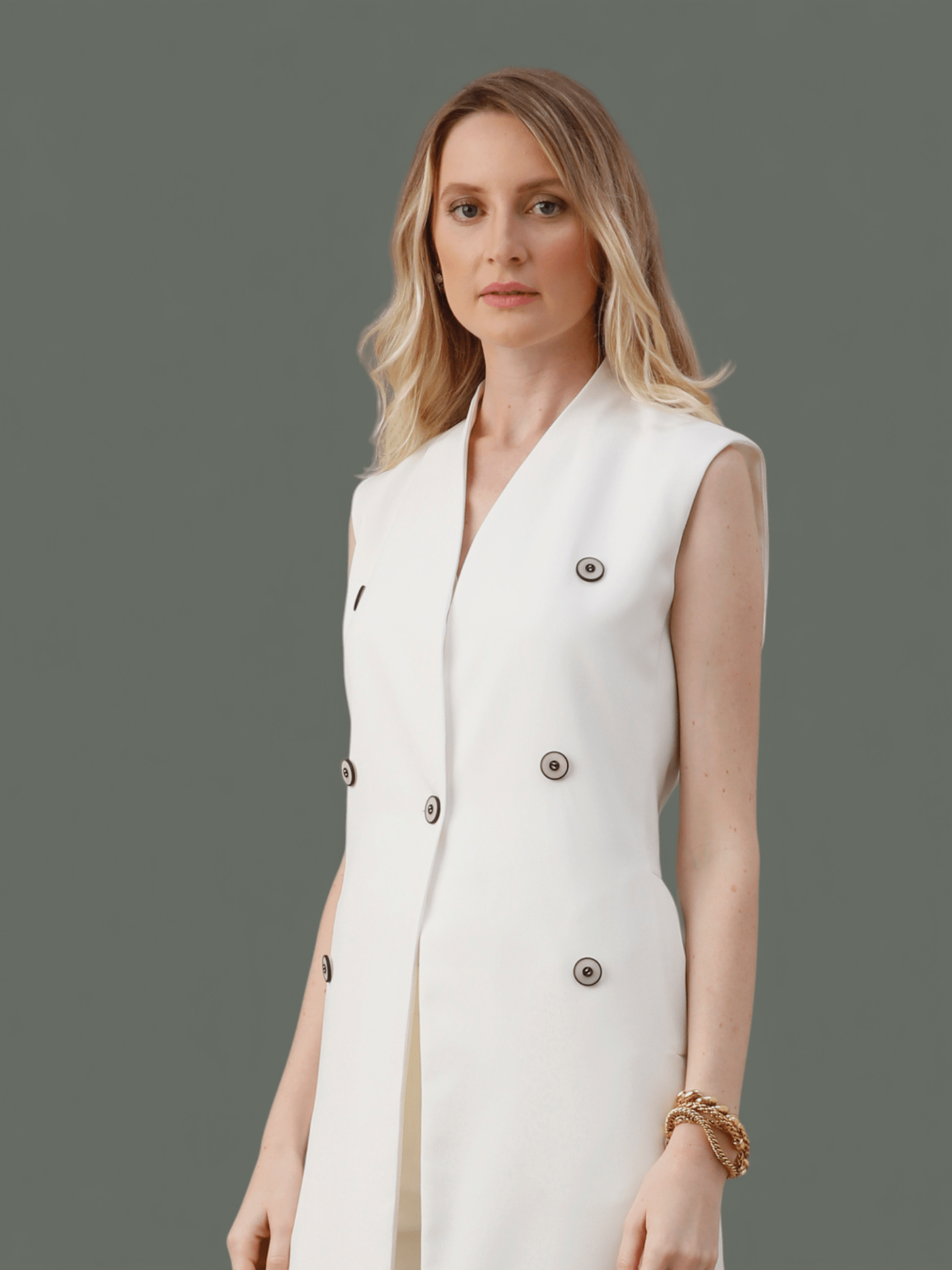 Trazendo a mesma alfaiataria minimalista e a elegância contemporânea do modelo original, o Colete Vivi traduz o design de inspiração couture em uma versão leve, sofisticada e versátil.