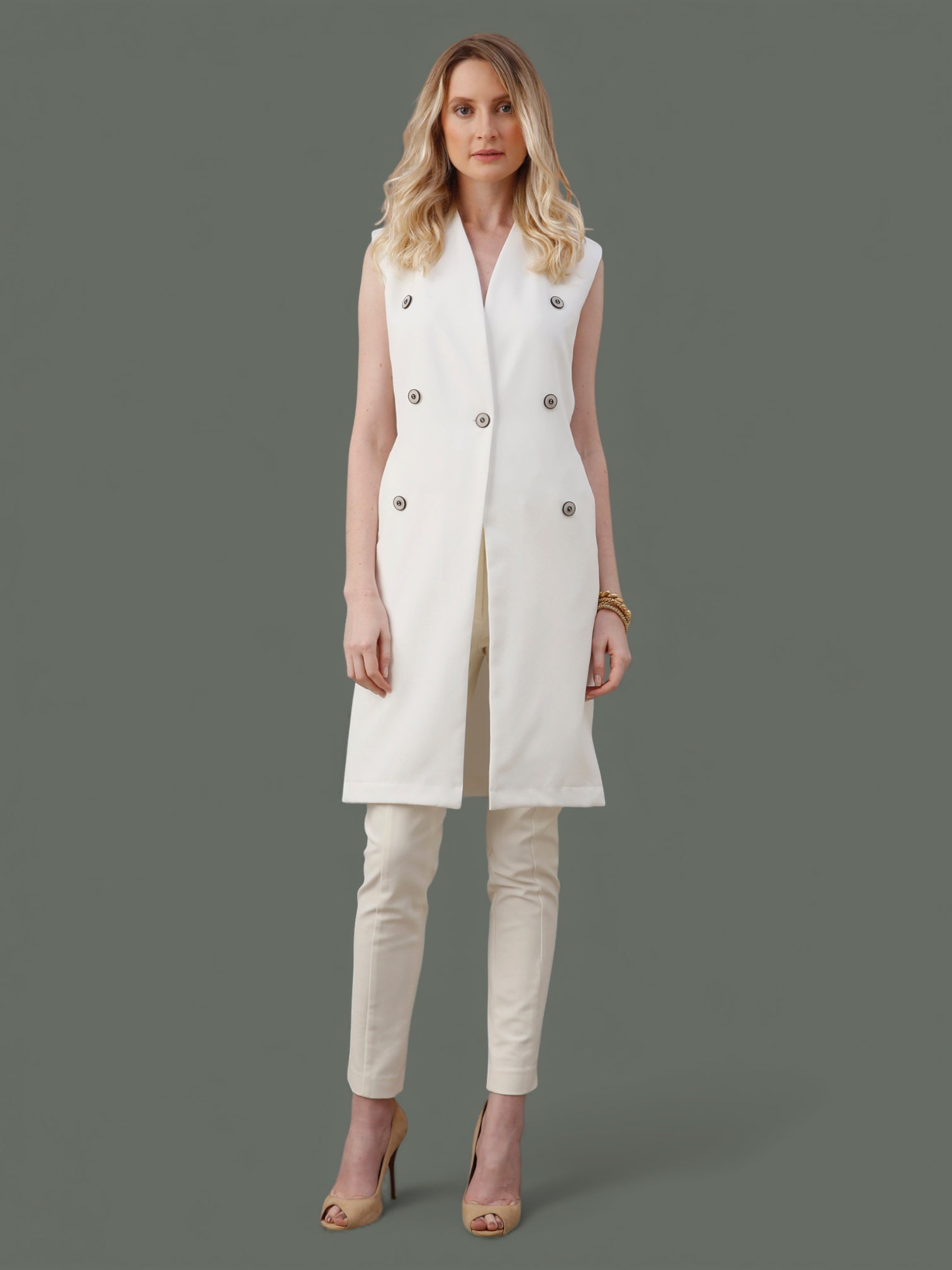 Com linhas limpas, estrutura impecável e botões bicolores que adicionam um toque refinado, o colete é perfeito para dias quentes ou para composições sobre saias, vestidos e calças de alfaiataria.
