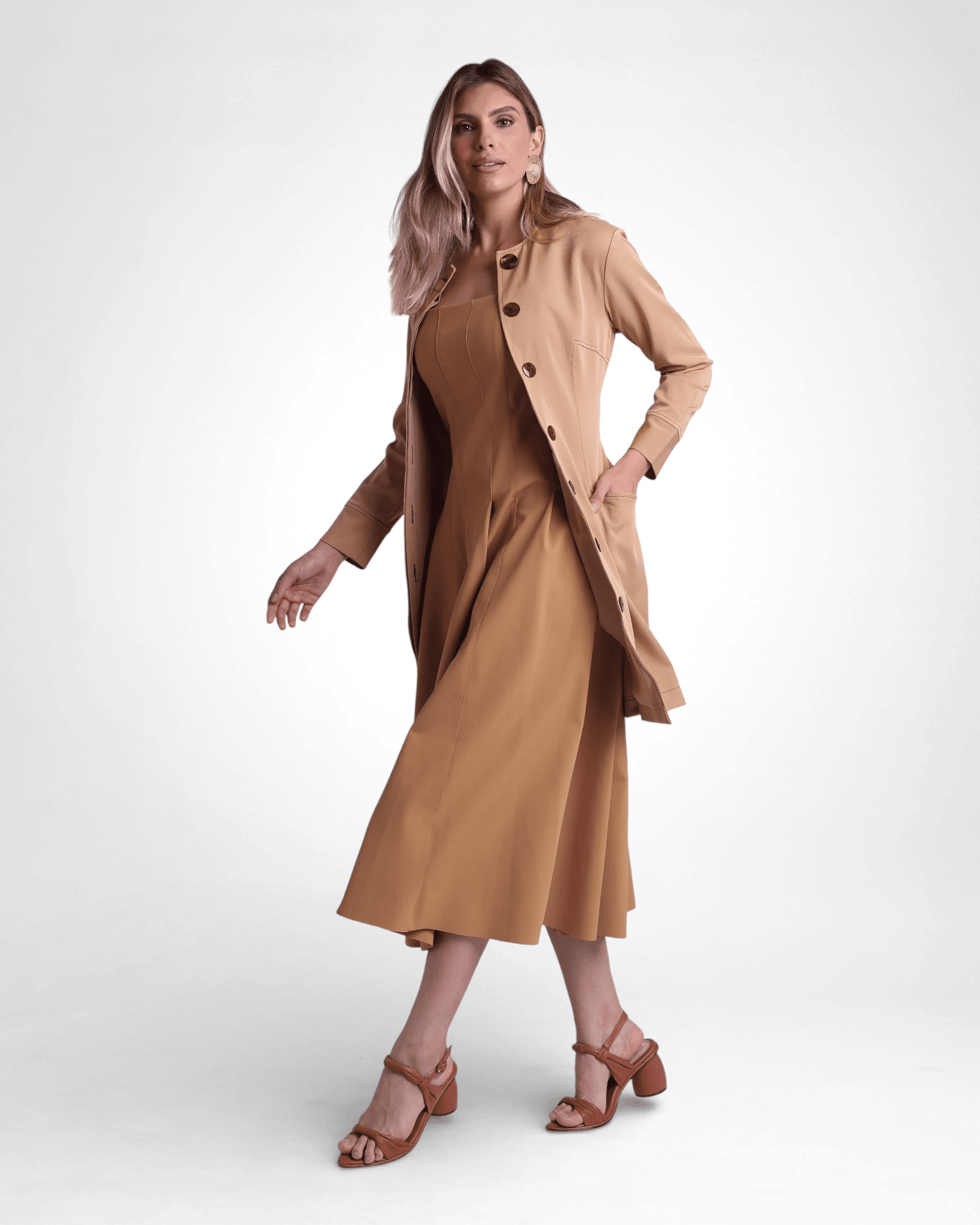 • Modelagem acinturada, inspirada em vestido clássico com cinto.