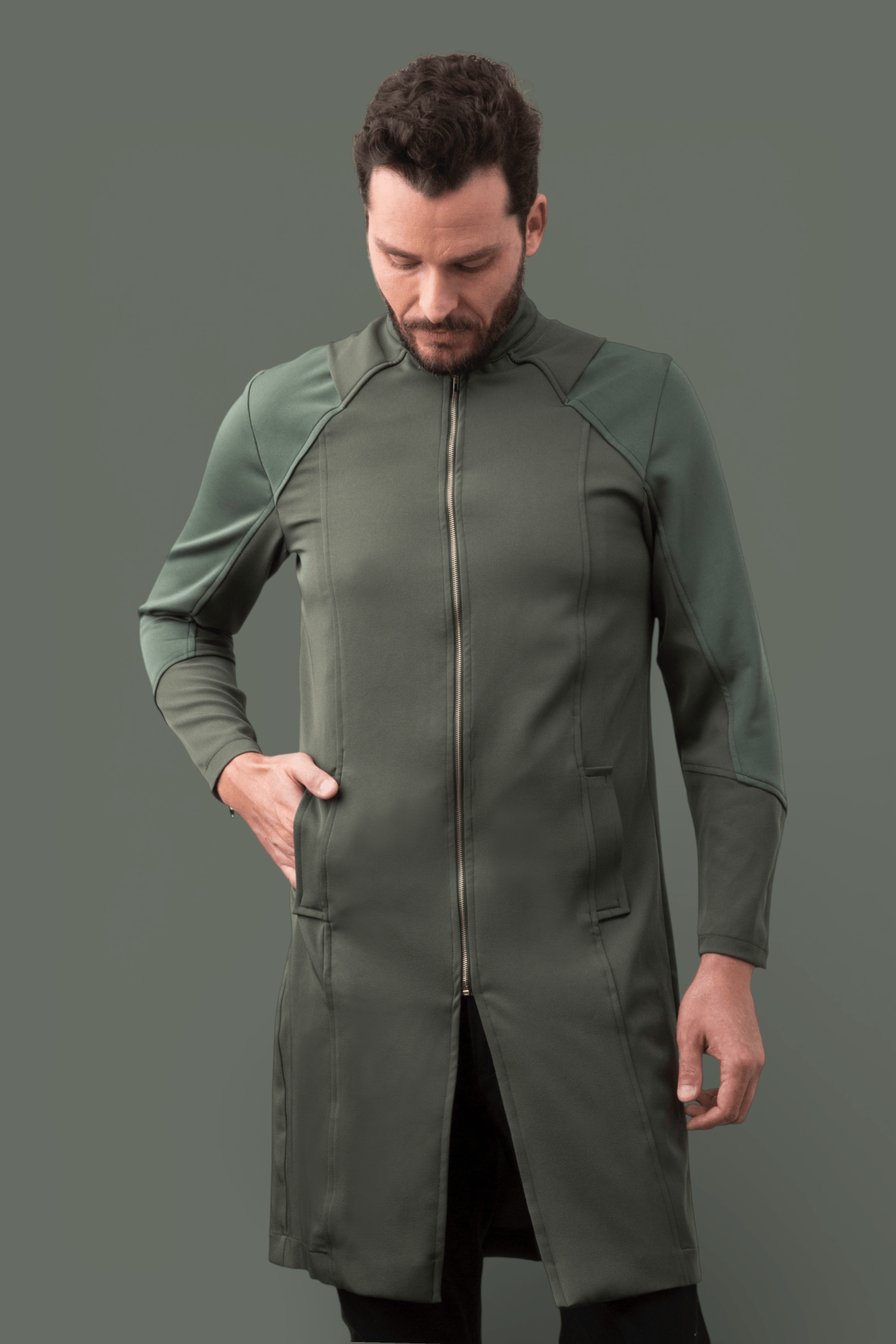 • Zíper frontal metálico exposto e zíperes invisíveis nos punhos, para acabamento contemporâneo.