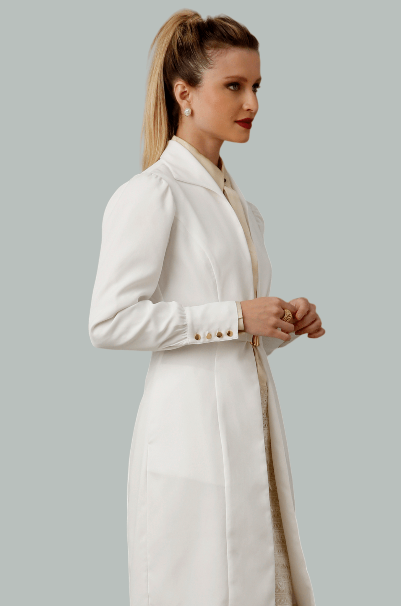 Confeccionado em um tom off-white impecável com detalhes em metal dourado, o Jaleco Premium Lucy é a escolha perfeita para profissionais que buscam sofisticação em cada detalhe. Sua silhueta acinturada, inspirada em vestido, traz feminilidade e refinamento ao ambiente clínico, entregando um visual polido sem abrir mão do conforto.
