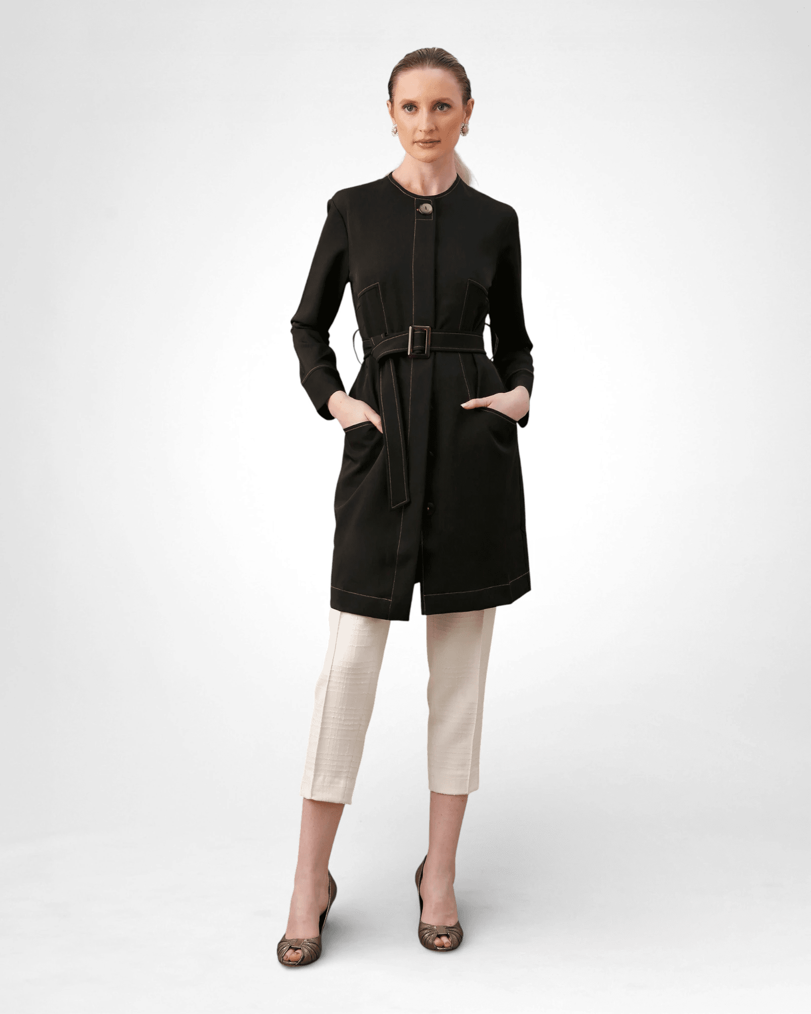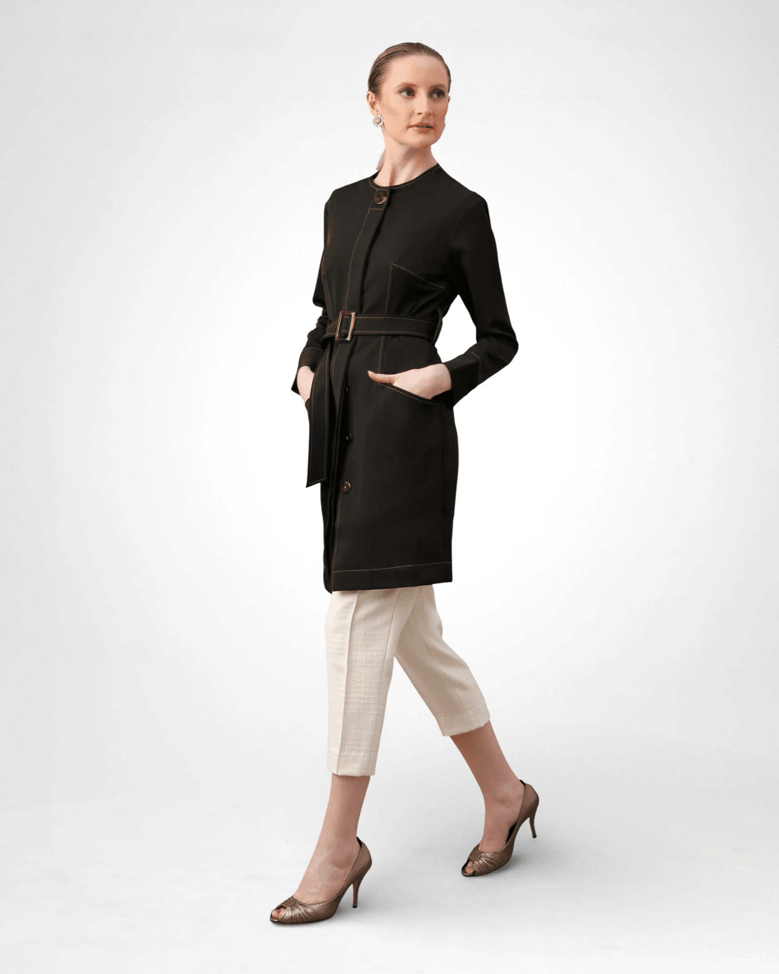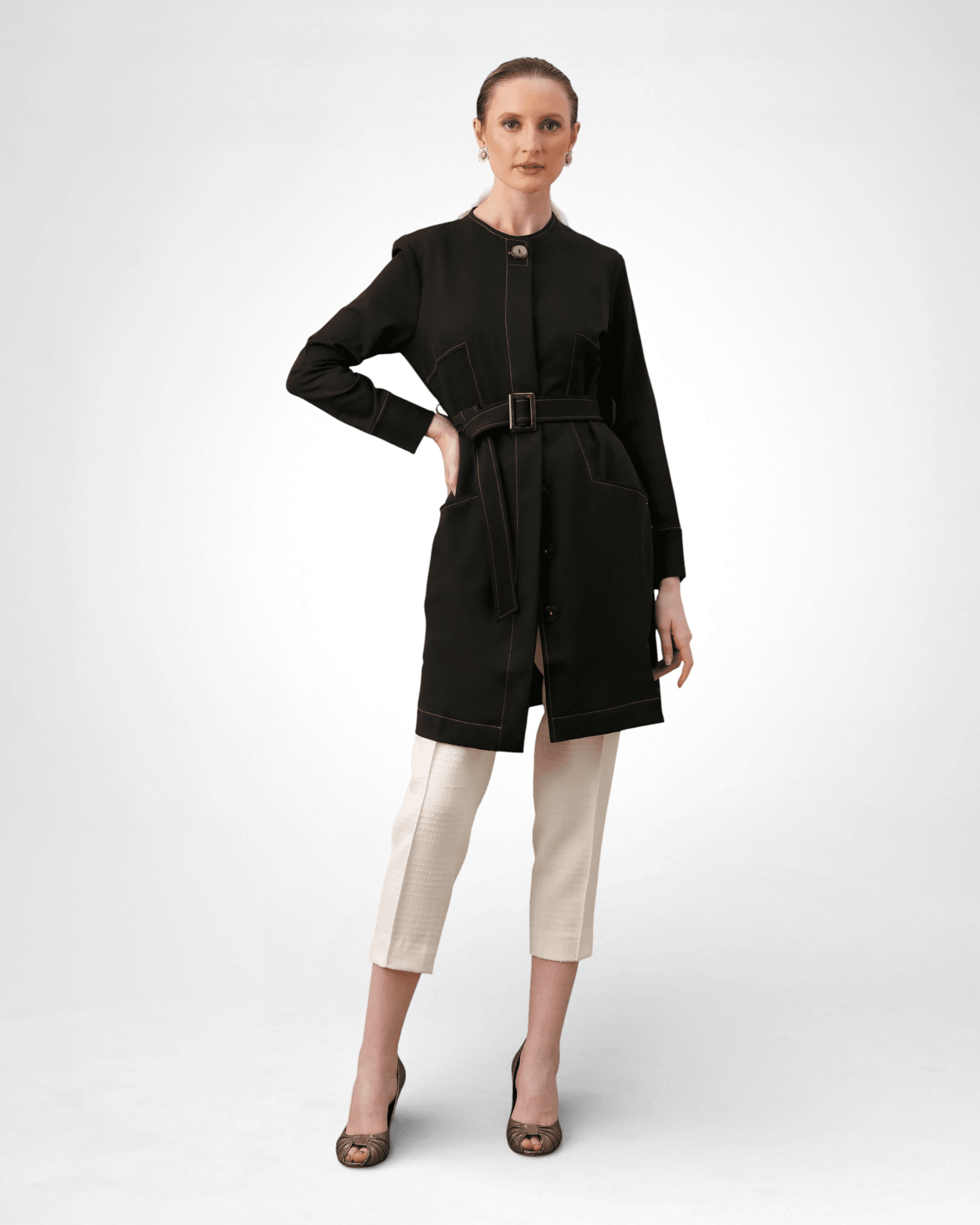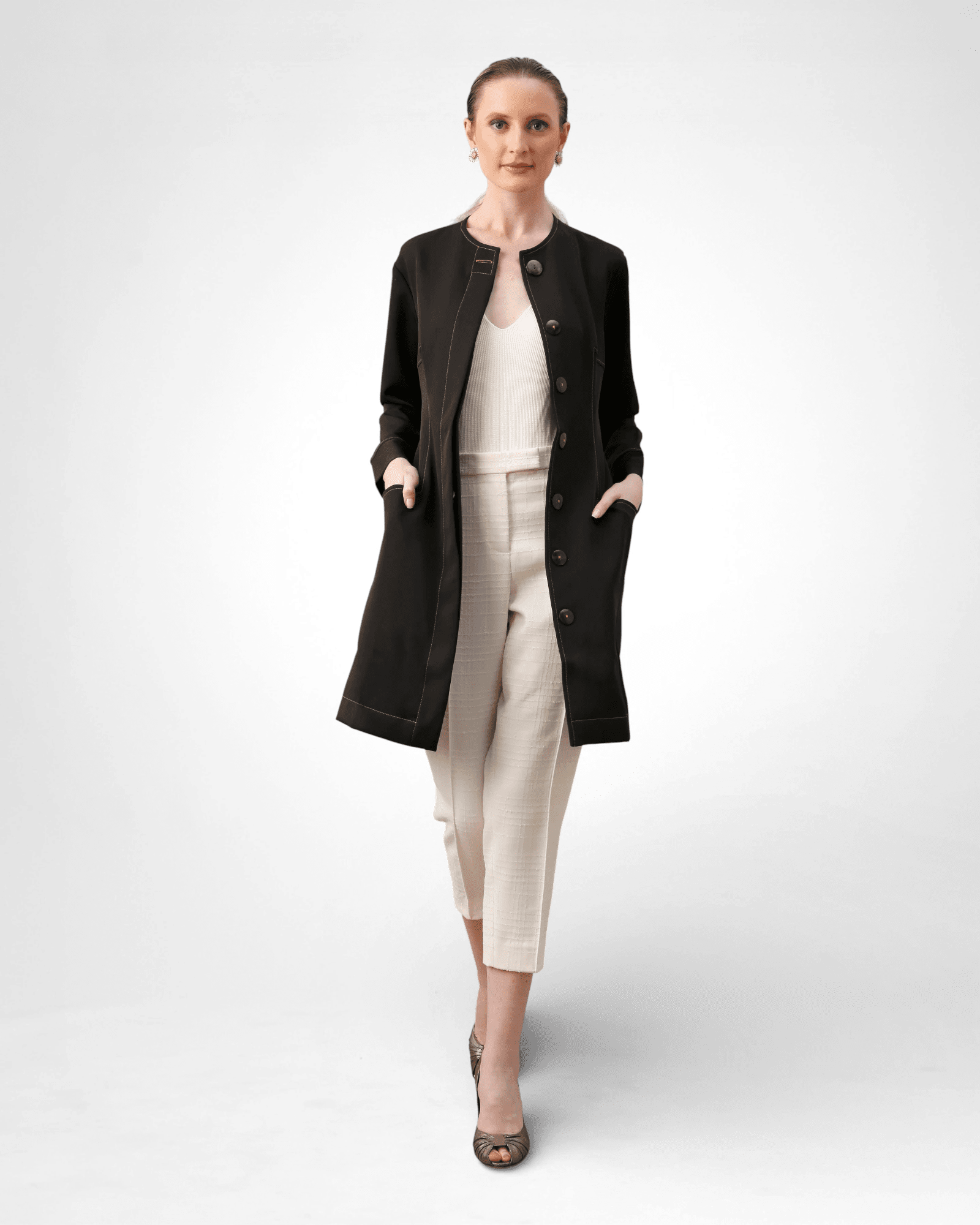 • Fechamento com botões internos frontais e botão externo marcante na lapela.