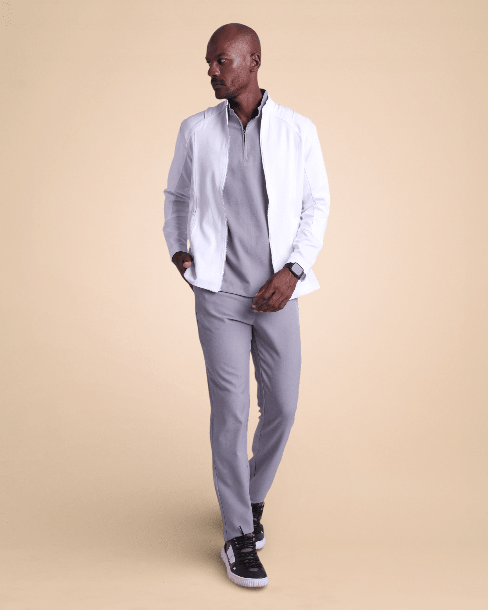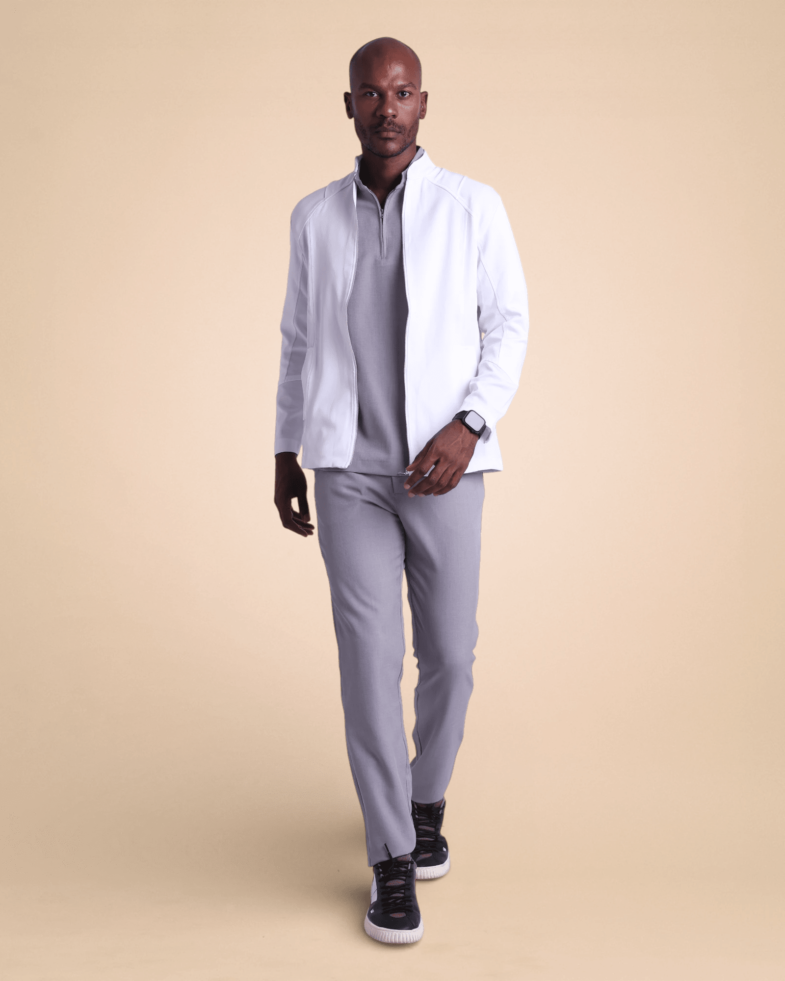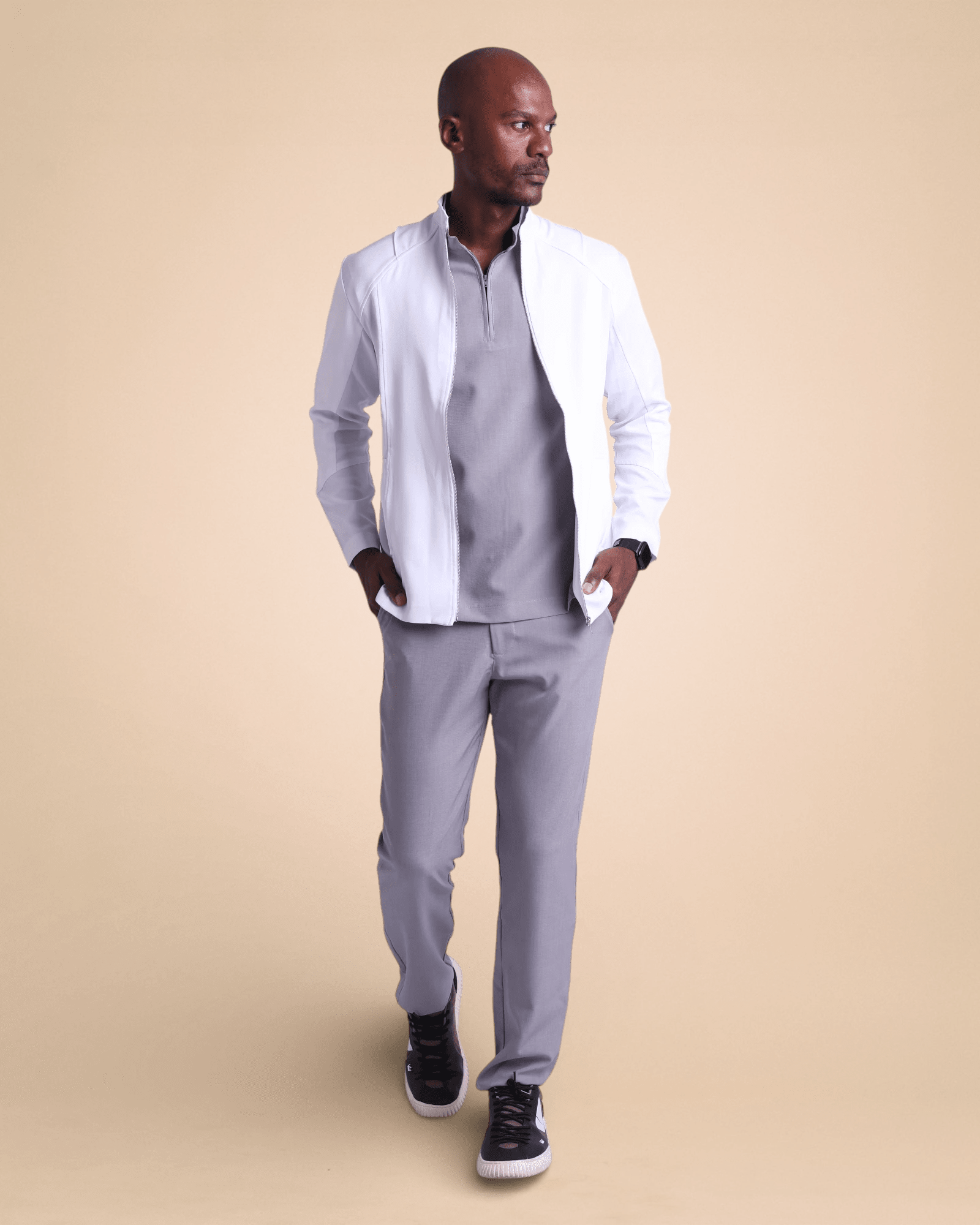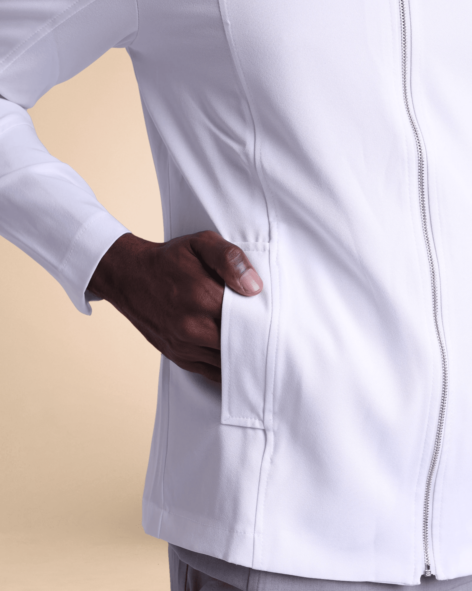 Zíperes metálicos expostos e zíperes invisíveis nos punhos reforçam seu visual esportivo e contemporâneo, enquanto os bolsos laterais funcionais adicionam praticidade ao ritmo acelerado de profissionais de alta performance.
